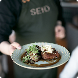 Seid var en form for trolldom i norrøn tid. Restauranten på toppen av K8-bygget henter inspirasjon fra vikingtiden og det gammelnordiske, med bål, flammer, rustikt interiør.